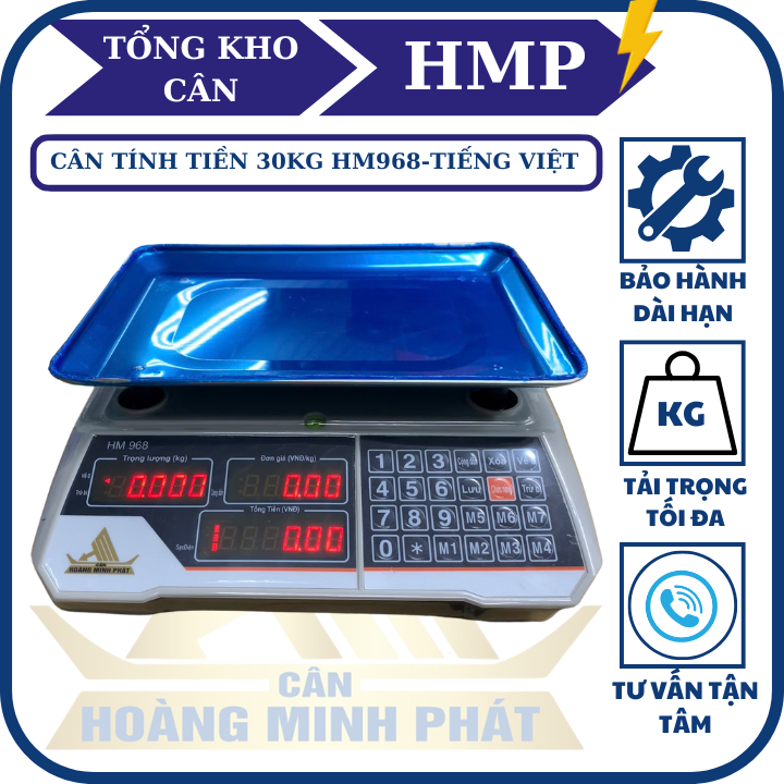 Cân điện tử tính tiền 30KG tiếng việt HM968. Thương Hiệu CÂN HOÀNG MINH PHÁT. Đĩa cân INOX. Cân hàng rau củ quả